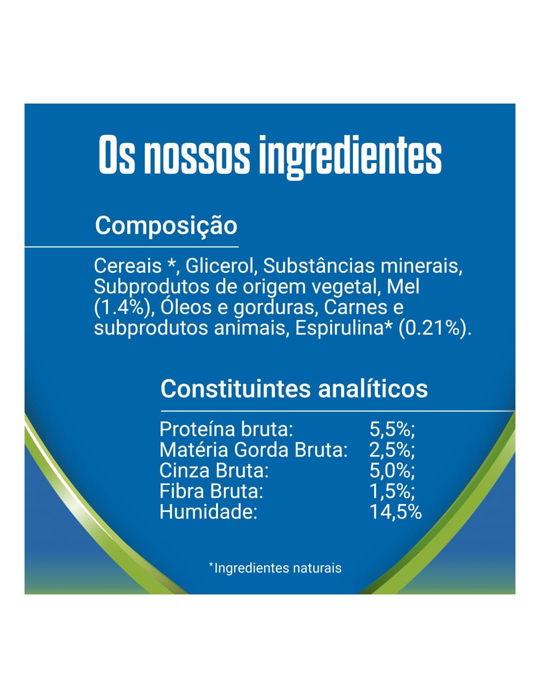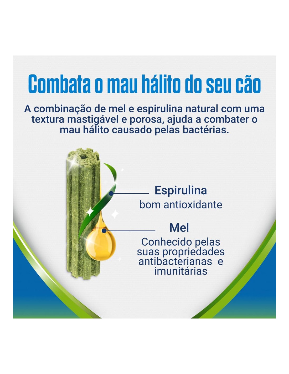 Contém spirulina e mel naturais, para ajudar a combater as causas do mau hálito em cães, em vez de o encobrir.