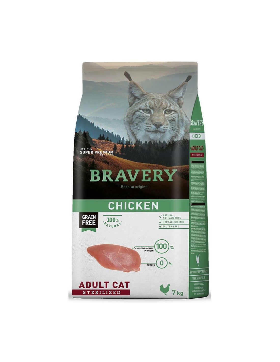 Bravery é ração natural e sem cereais, é uma ração completa de frango para todas as raças de gatos adultos esterilizados.