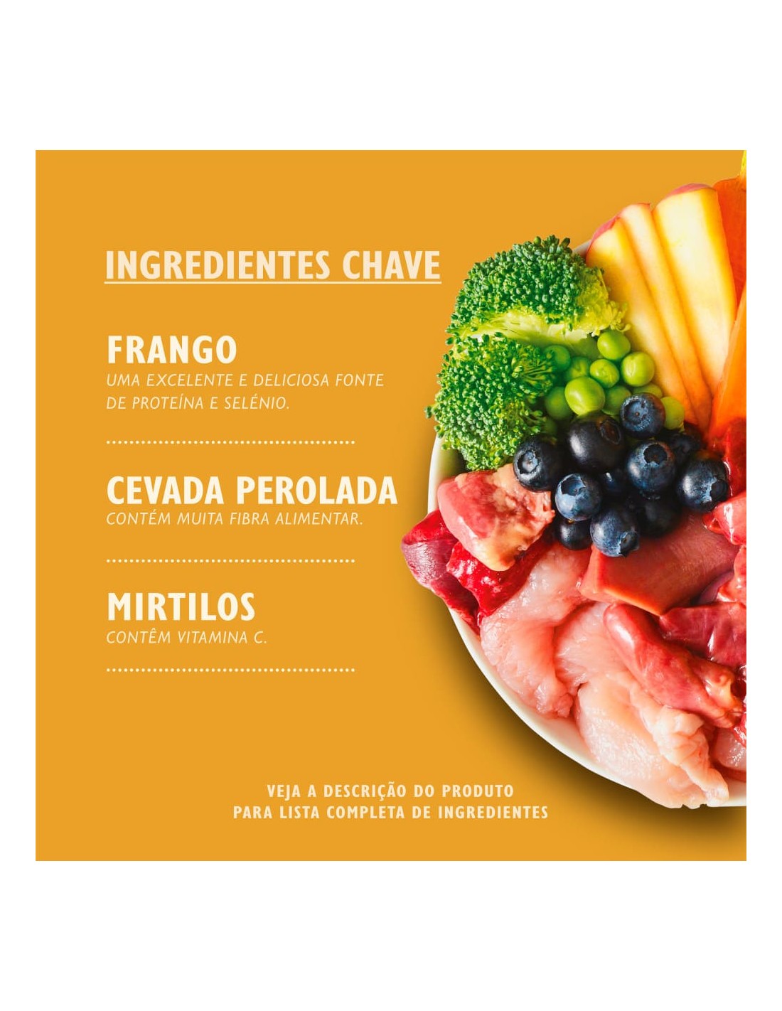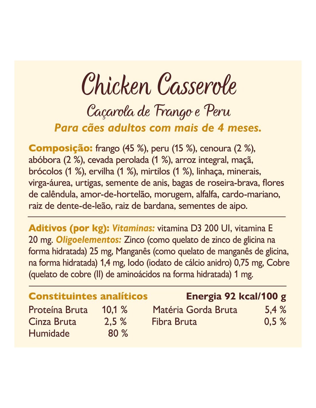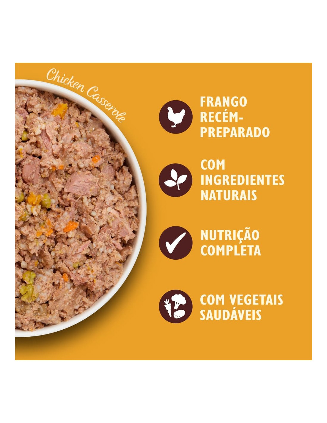 Alimento em patê elaborado com frango fresco e peru, arroz integral, vegetais e frutas - maçãs, brócolos, ervilhas e amoras e com uma combinação única de ervas aromáticas.