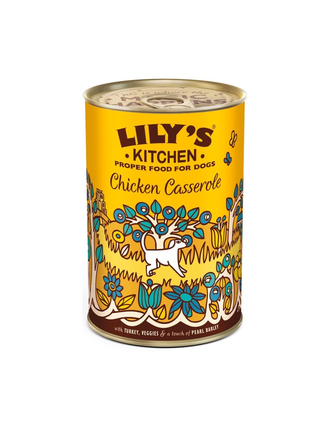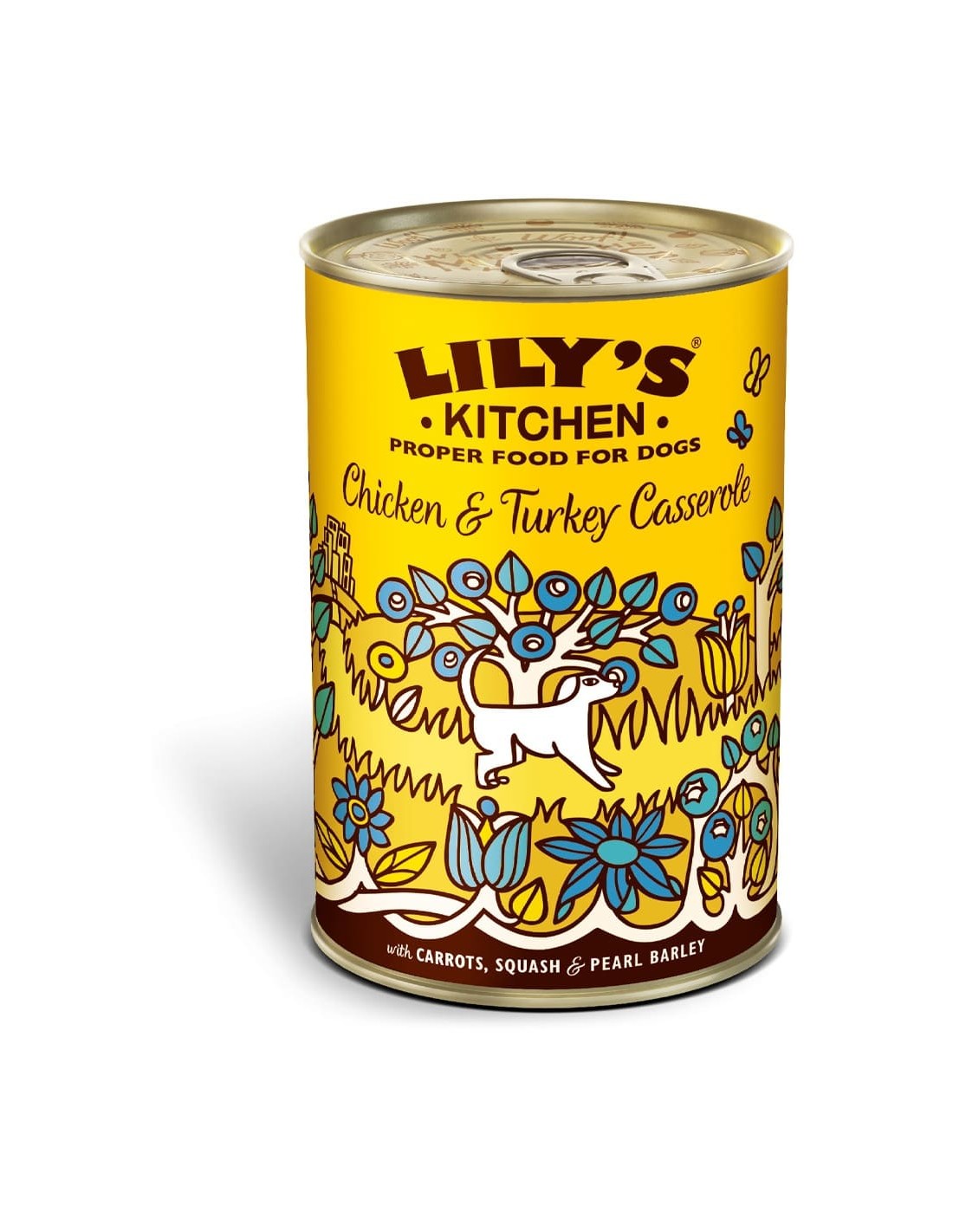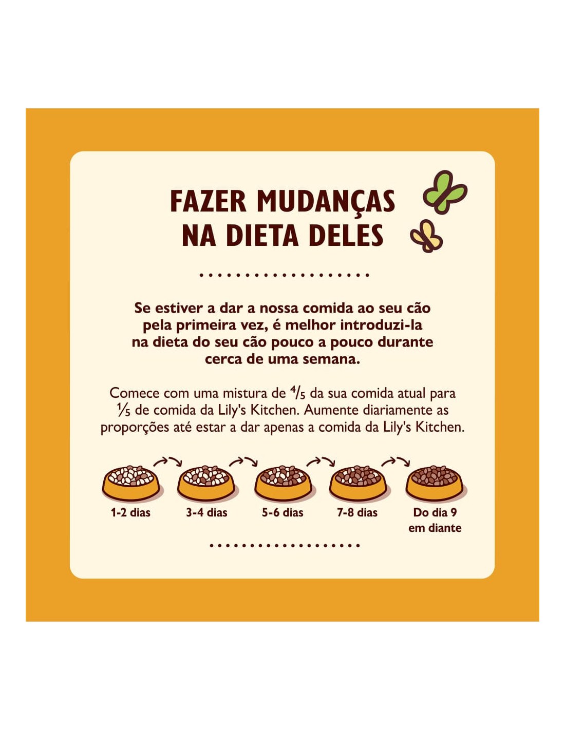 Alimento em patê elaborado com frango fresco e peru, arroz integral, vegetais e frutas - maçãs, brócolos, ervilhas e amoras e com uma combinação única de ervas aromáticas.
