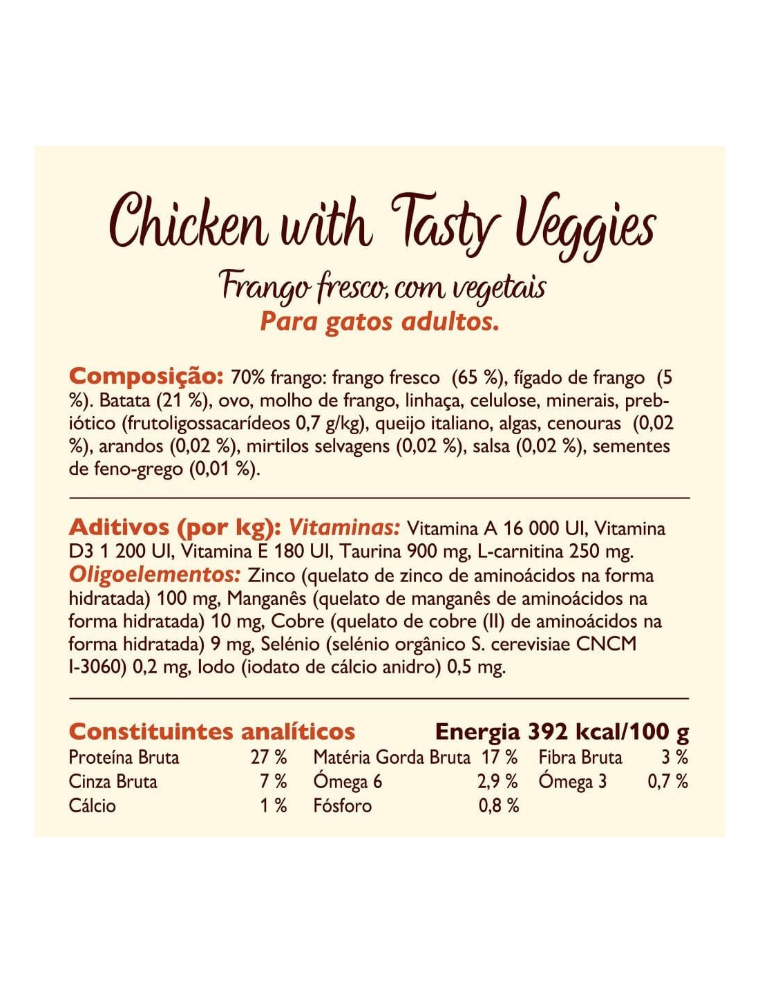 Aditivos nutritivos/kg: Vitamina A (como Acetato de Retinilo) 16,000 UI, Vitamina D3 (como Colecalciferol) 1,200 UI, Vitamina E (como Acetato de Alfa Tocoferol) 180 UI. Taurina 900mg, L-Carnitina 250mg. Oligoelementos: Zinco (como Quelato de Zinco de Aminoácidos, na forma hidratada) 50mg, Manganês (como Quelato de Manganês de Aminoácidos, na forma hidratada) 10mg, Cobre (como Quelato de Cobre (II) de Aminoácidos, na forma hidratada) 9mg, Selénio (como Selénio Biológico S. cerevisiae CNCM 1-3060) 0.1mg, Iodo (como Iodato de Cálcio Anidro) 0.5mg.