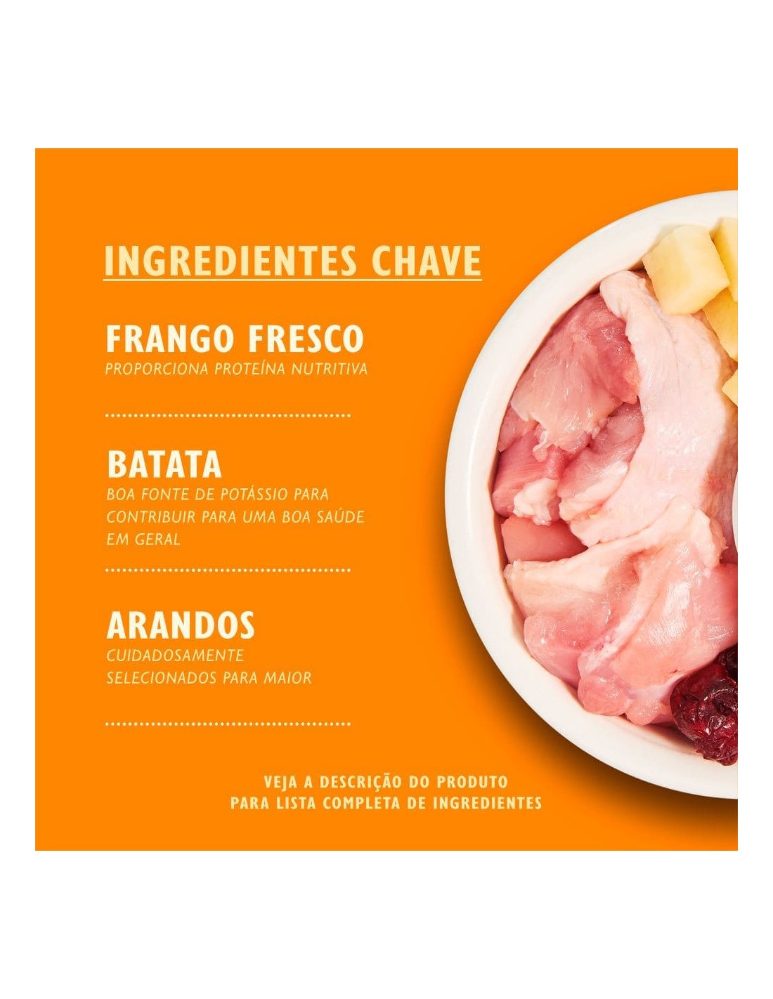70% Frango: Frango fresco (65%), Fígado de frango (5%); Batata (21%), Ovo, Molho de frango, Sementes de linhaça, Celulose, Substâncias minerais, Prebiótico (Fructo-oligosacarídeos 0.7g/kg), Queijo italiano, Algas, Cenouras (0.02%), Arandos, Mirtilos, Salsa (0.02%), Sementes de feno grego.