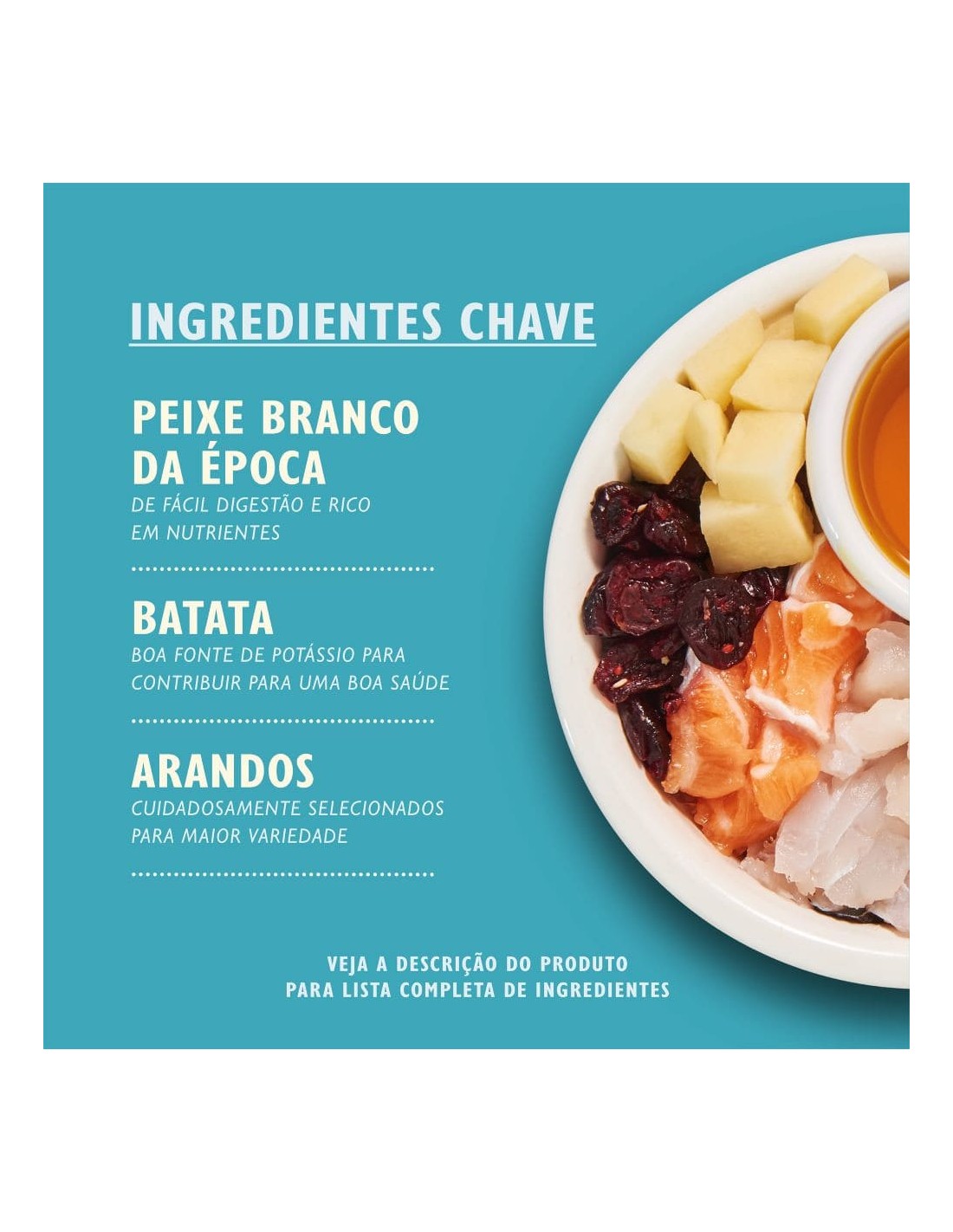 70% Peixe Preparado fresco: Peixe branco sazonal (52.5%), Salmão (17.5%). Batata, Proteína de batata, Ovo, Molho de frango, Celulose, Molho de Peixe, Sementes de linhaça, Prebiótico (Fructo-oligosscarídeos 0.7g/kg), Queijo italiano, Algas, Cenouras, Arandos, Mirtilos, Salsa, Sementes de feno grego.