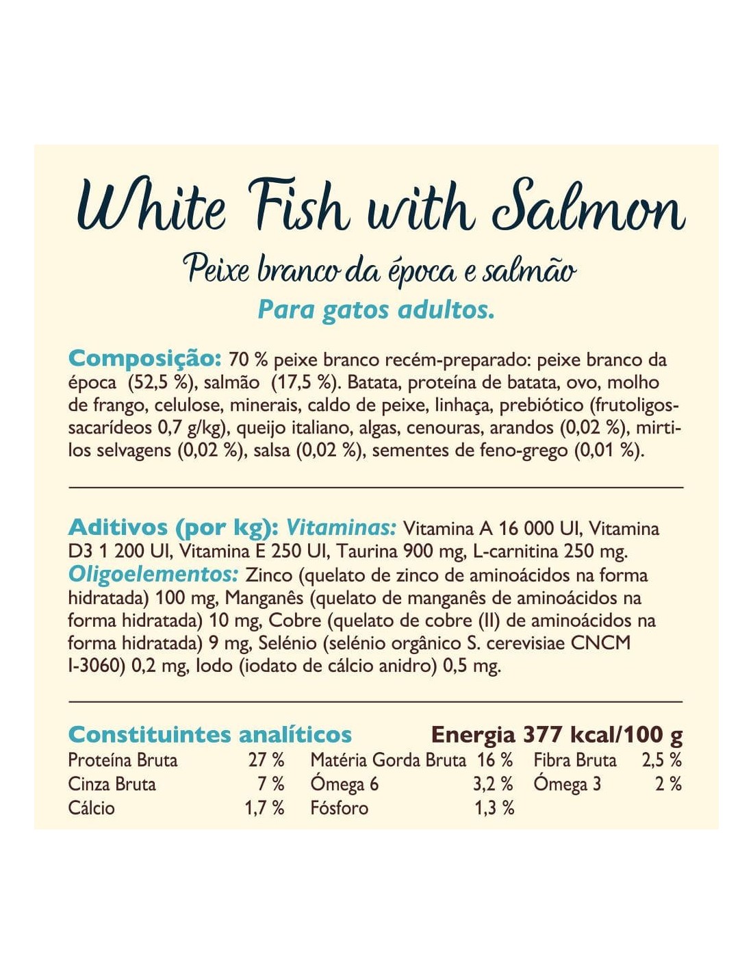 Proteína bruta: 27.0%, Matéria gorda bruta 16.0%, Fibra bruta 2.5%, Cinza bruta 7.5%, Ácidos gordos Ómega 6: 3.2%, Ácidos gordos Ómega 3: 2.0%, Cálcio 1.7%, Fósforo 1.3%. Energia 377 kcal/100g.