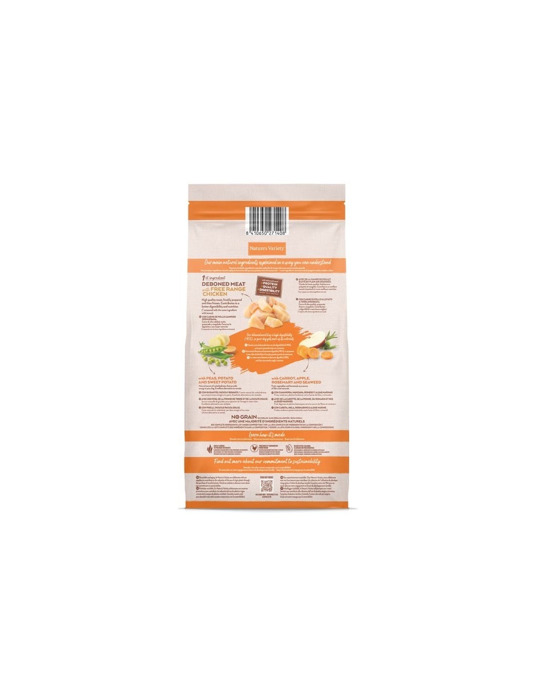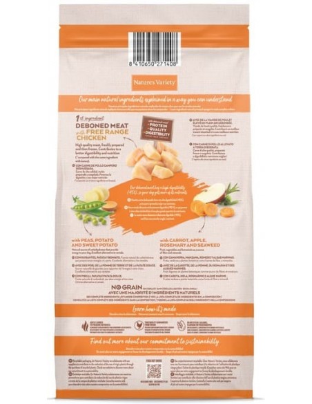 Carne de frango criado ao ar livre desossada* (30%), proteína desidratada de frango (22%), ervilhas desidratadas* (12%), grão de bico desidratado* (5,5%), amido de ervilha*, gordura de aves* (5%), batata doce desidratada* (4%), hidrolisado de proteína (3,5%), fécula de batata*, fibra de ervilha*, raiz de chicória desidratada*, substâncias minerais, cenoura desidratada* (0,5%, equivalente a 4% de cenoura fresca), brócolos desidratados* (0,5%, equivalente a 4% de brócolos frescos), maçã desidratada* (0,3%, equivalente a 2% de maçã fresca), alga desidratada* (0,01%), alecrim desidratado* (0,01%).