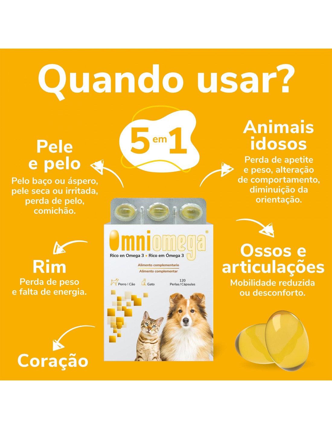 Omniomega alia a maior quantidade de EPA e DHA, os ómega 3 de maior eficácia, com o efeito antioxidante da Vitamina E numa formulação em cápsulas, com múltiplos benefícios em problemas dérmicos, cardiovasculares, renais, neurais, ortopédicas e oncológicas.