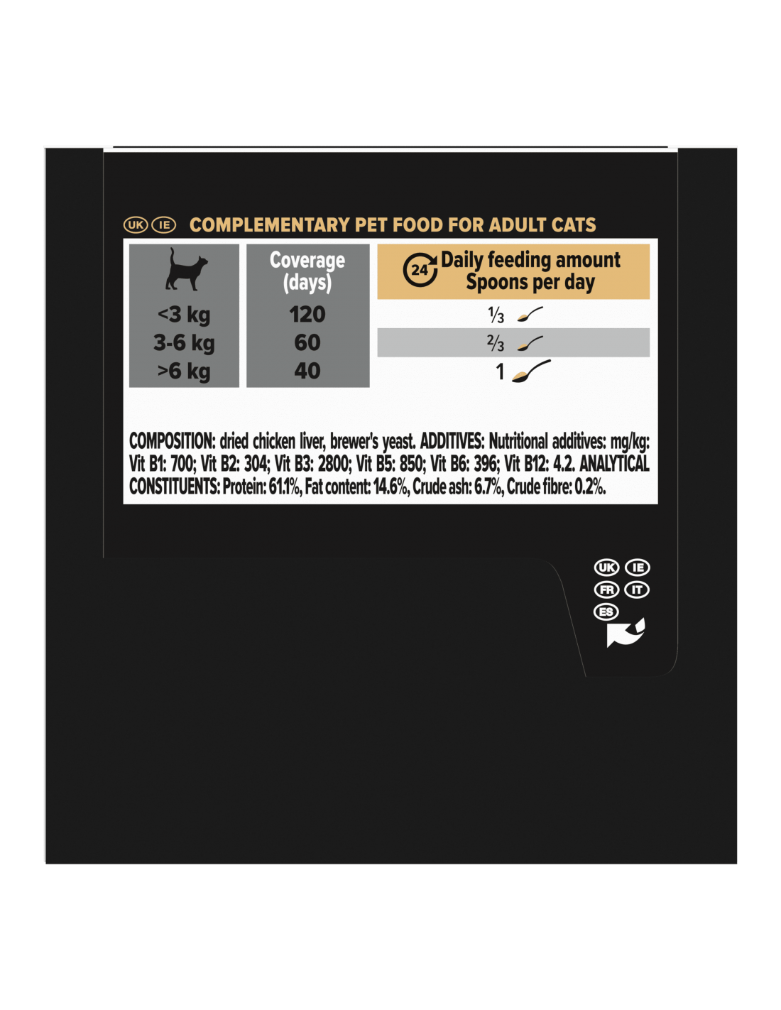 PRO PLAN® Multivitamins + ajuda a manter o seu gato cheio de vitalidade porque contém um complexo vitamínico (B1, B2, B3, B5, B6, B12) e está cientificamente formulado para:
