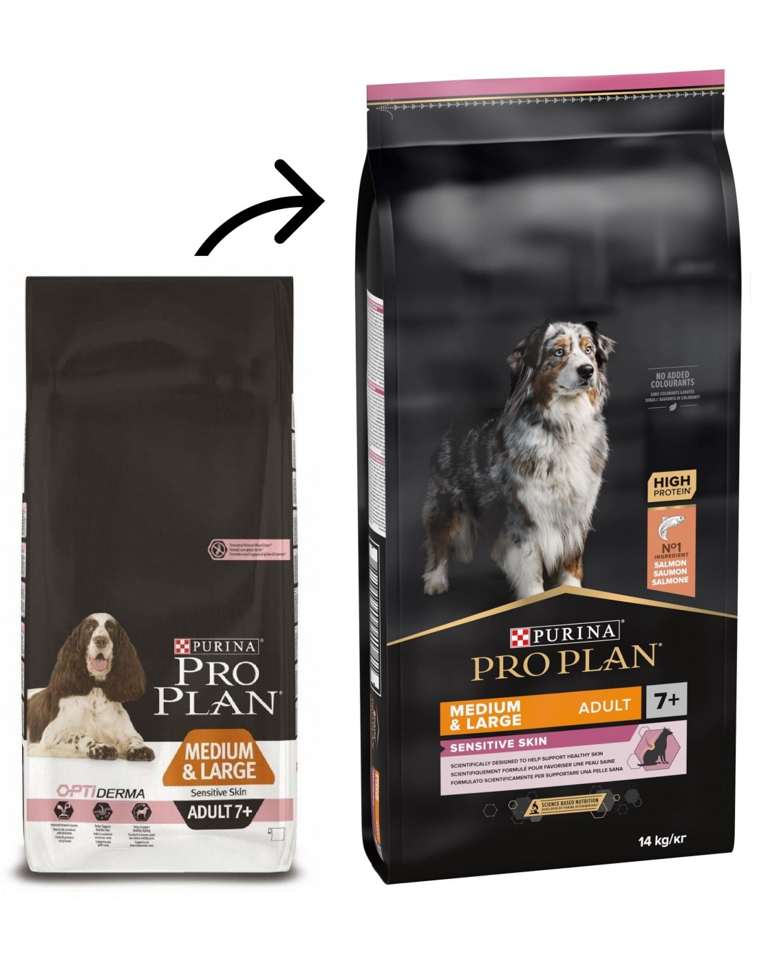 Purina® PRO PLAN® Medium & Large Adult 7+ Pele Sensível, é um alimento completo para cães sensíveis de tamanho médio e grande, com mais de 7 anos de idade, que promove uma pele saudável e um pelo bonito e brilhante.