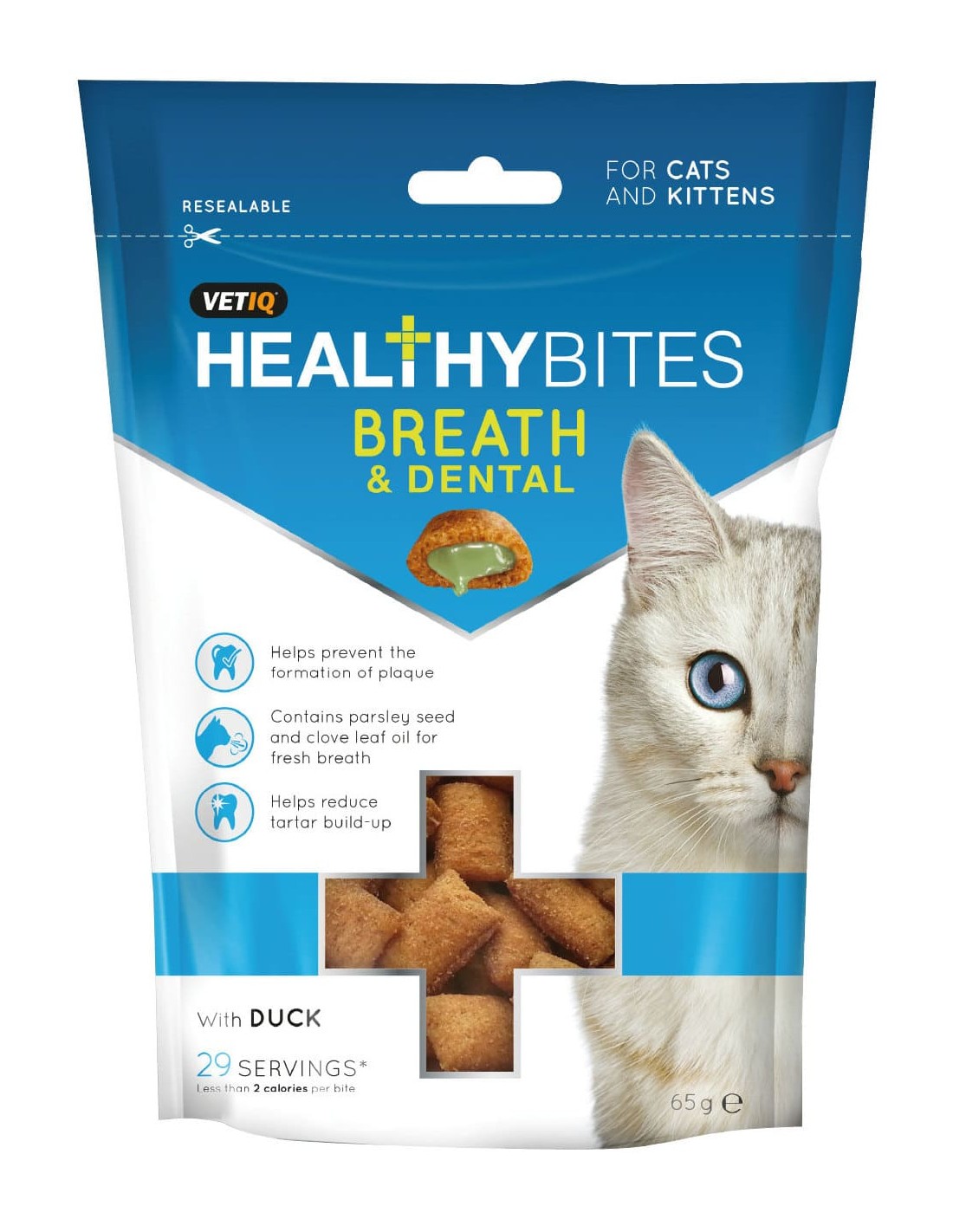 Biscoitos de pato, que ajudam na prevenção da formação de placa bacteriana, além de ajudarem a reduzir a acumulação de tártaro. Contém sementes de salsa e óleo de folhas de cravo, que contribuem para um hálito fresco.