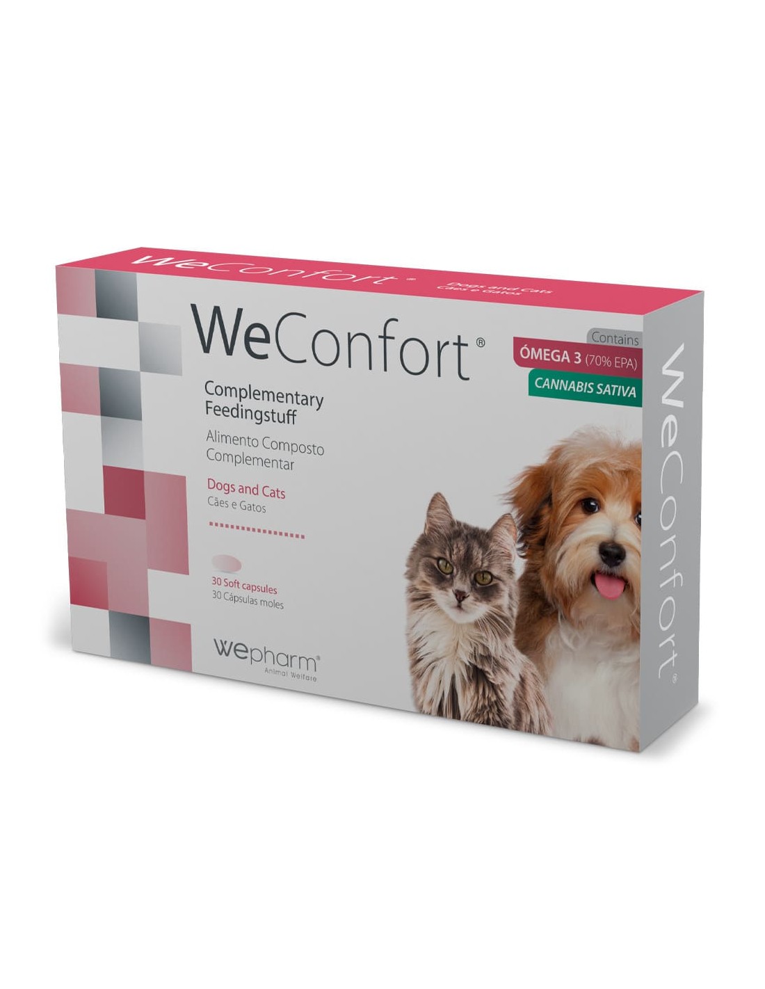 Weconfort é um alimento complementar para cães e gatos, para apoio nutricional da função sensorial e promoção do bem-estar geral, nomeadamente no controlo de processos relacionados com dor e inflamação.