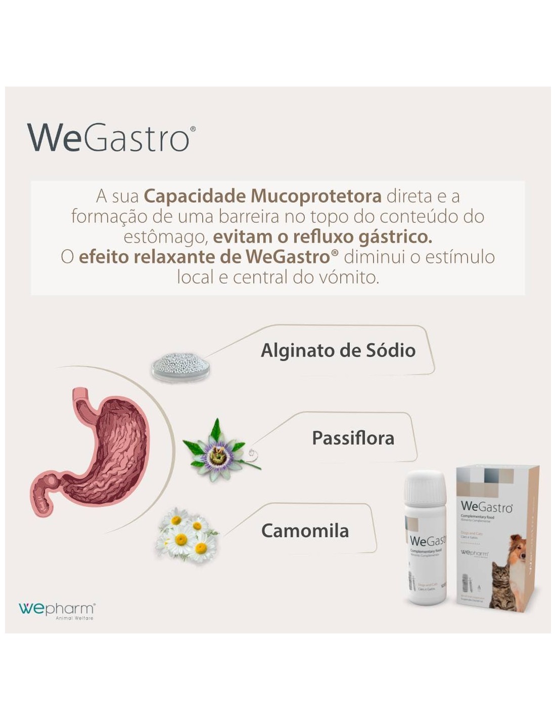 WeGastro é um composto complementar para cães e gatos, constituído por ingredientes que contribuem para a proteção e manutenção da normal função gástrica. Atua através da capacidade mucoprotetora direta e da formação de uma barreira no topo do conteúdo estomacal, tendo um efeito relaxante que diminui o estímulo local e central do vómito.